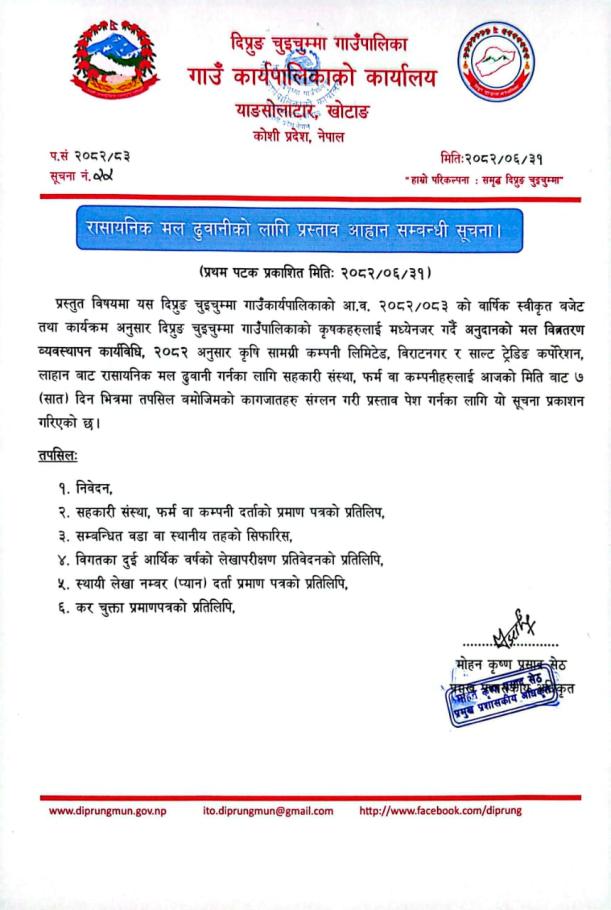 रासायनिक मल ढुवानिको लागि प्रस्ताव आह्वान सम्बन्धि सूचना ।