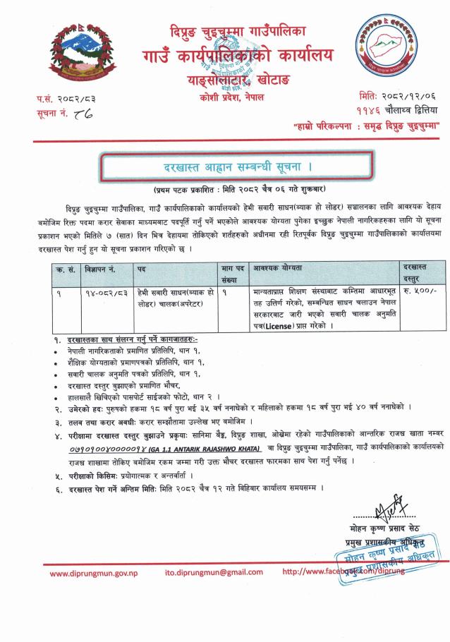सेवा करारमा कर्मचारी पदपूर्ति सम्बन्धी सूचना !!! (हेभी सवारी साधन-अपरेटर)