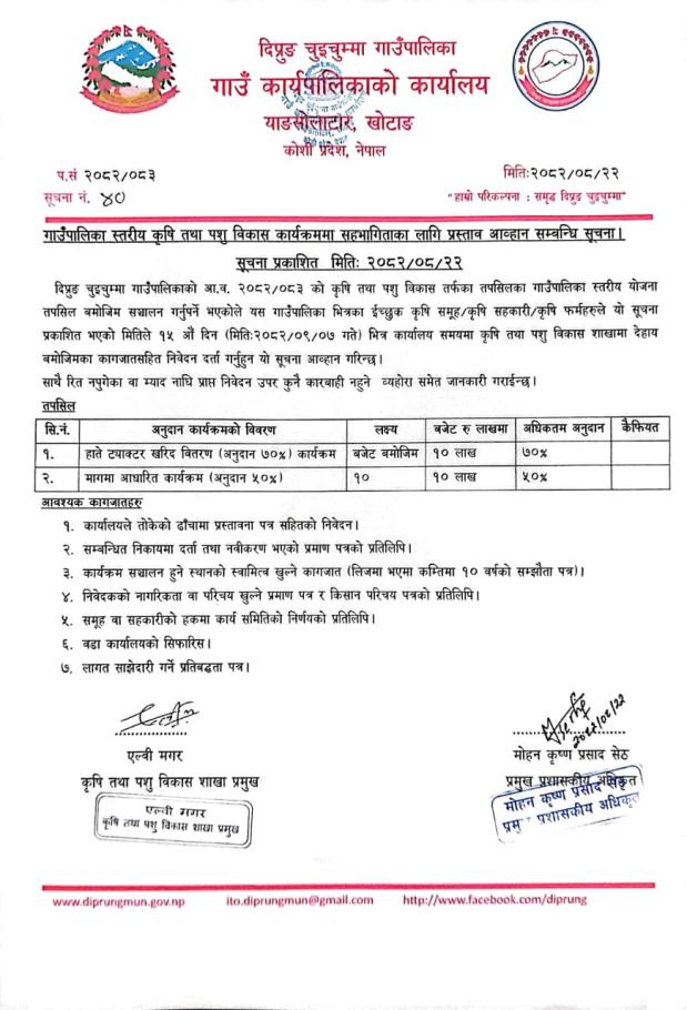 गाउँपालिका स्तरीय कृषि तथा पशु विकास कार्यक्रममा सहभागीका लागि प्रास्ताव आव्हान सम्बन्धी सूचना !!(आ.व. २०८२/८३)