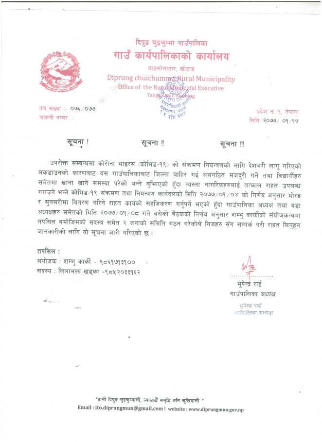 दिप्रुङ चुइचुम्मा गाउँपालिकाबाट मोरङ र सुनसरी जिल्लामा गइ असंगठित क्षेत्रमा मजदुरी गर्ने र विद्यार्थीहरुलाई दिप्रुङ चुइचुम्मा गाउँपालिकाले राहत वितरण गर्ने सम्बन्धी सूचना !