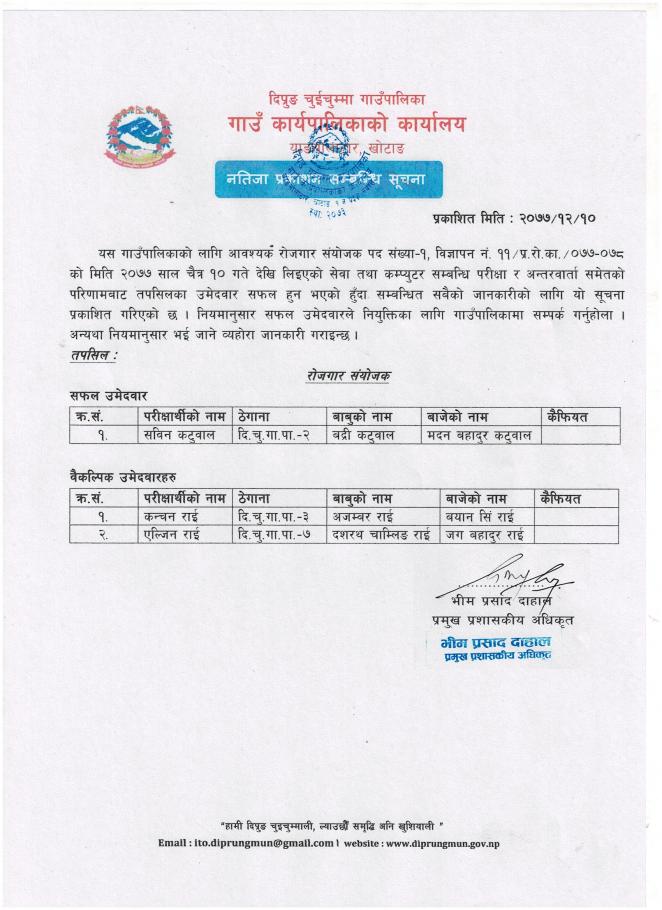 रोजगार संयोजक पदको अन्तिम नतिजा प्रकाशन सम्बन्धि सूचना ।