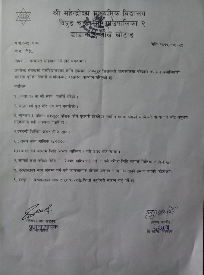 श्री महेन्द्राेदय माध्यिमक विद्यालयलाई कम्प्युटर शिक्षक अावश्यकता सम्वन्धी सूचना