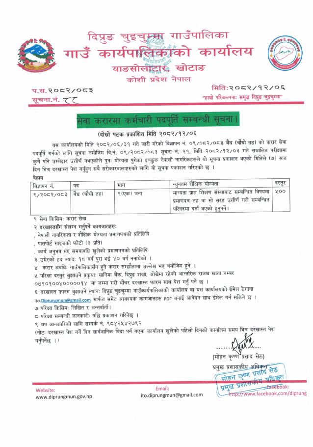 सेवा करारमा कर्मचारी पदपूर्ति सम्बन्धी पुनःसूचना !!! (वैद्य-चौथों)